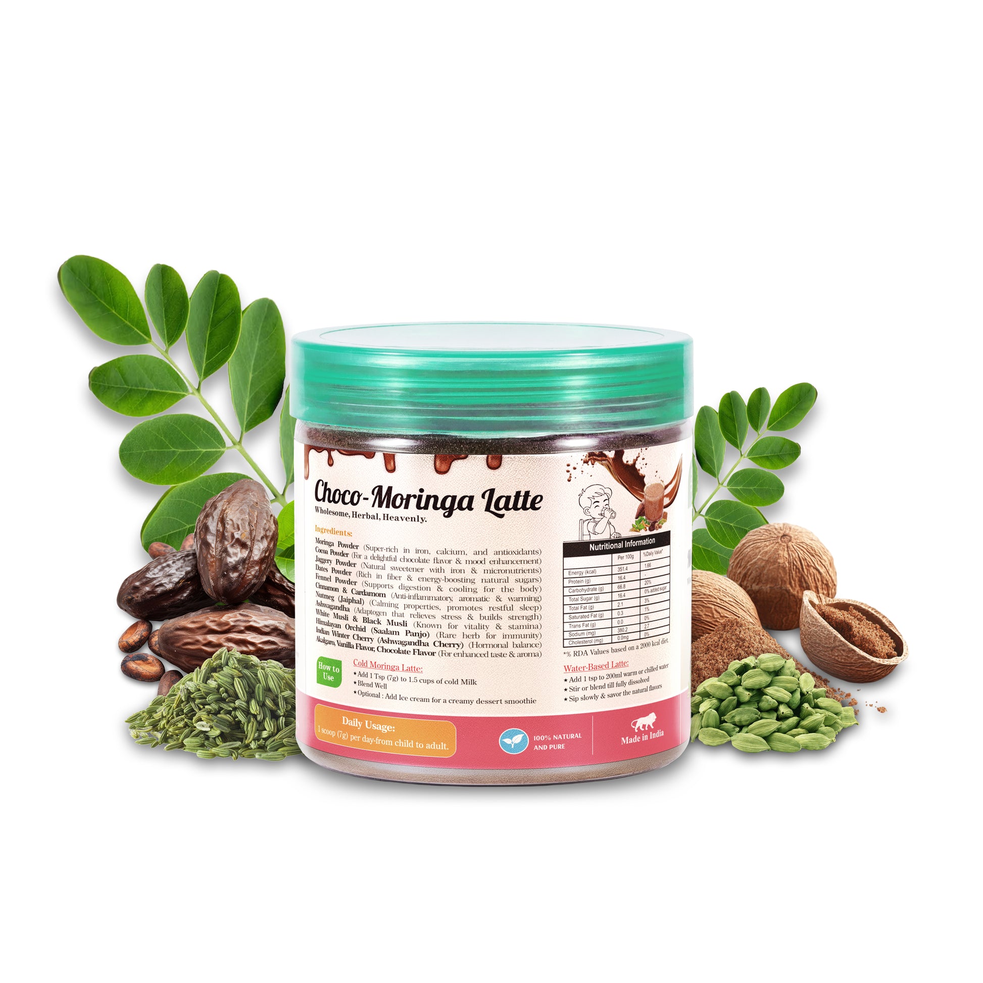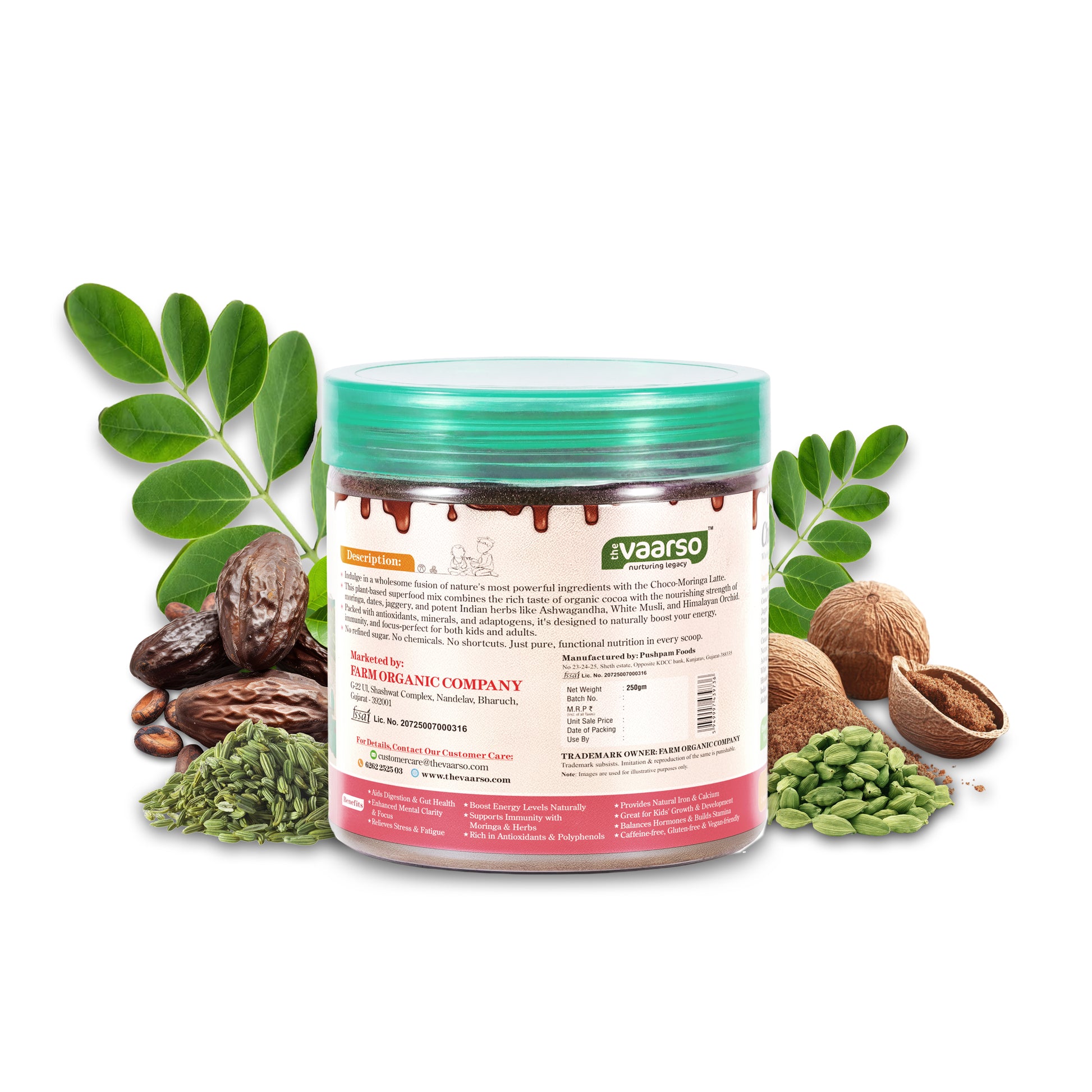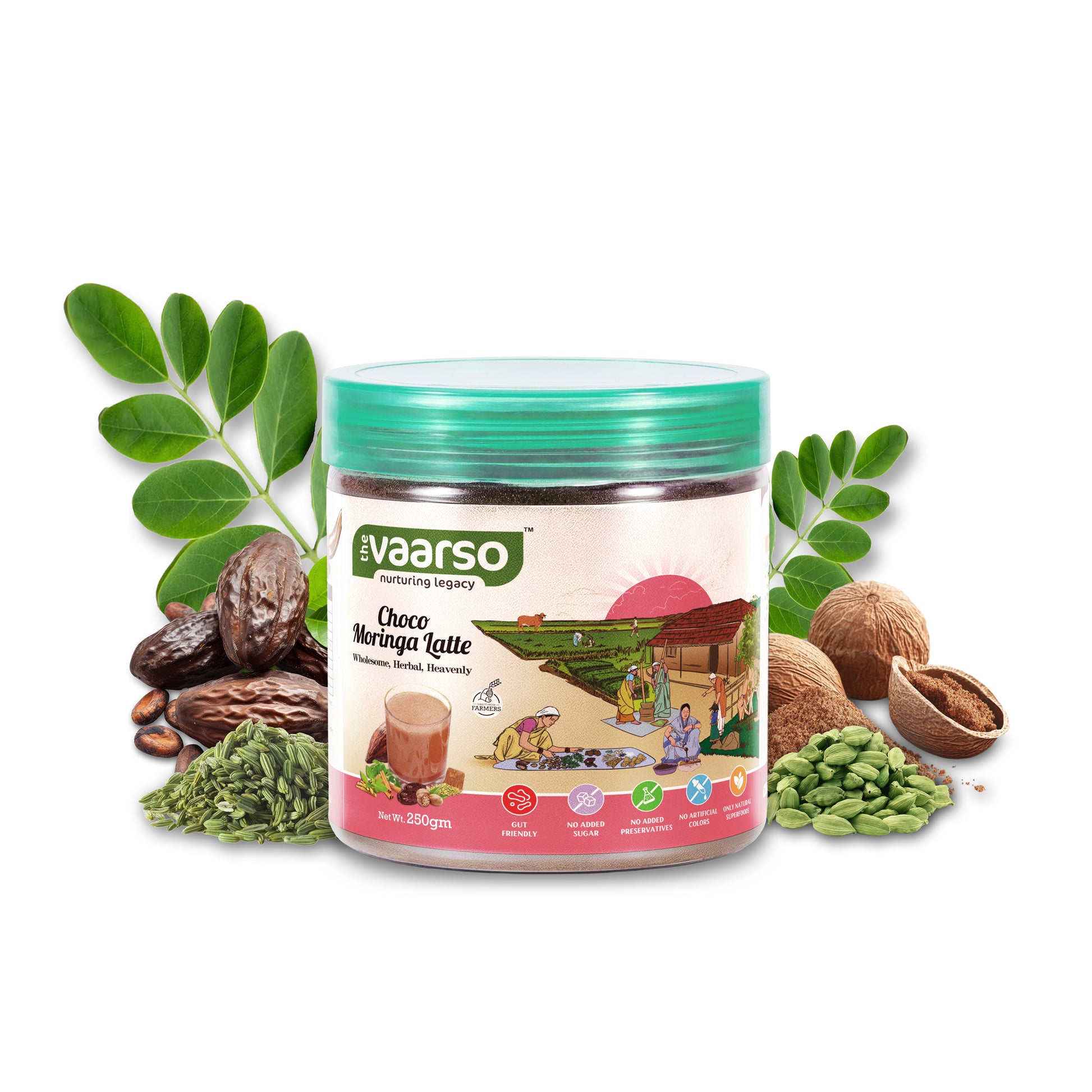 Indulge in nourishment with The Vaarso Chocolate Moringa Latte — a cacao-kissed supergreen blend combining the lush vibrancy of moringa with smooth chocolate notes. This caffeine-free elixir supports energy, stress balance, and antioxidant wellness. Stir a scoop into warm milk, blend into your smoothie, or sip it over ice — for a daily moment of delicious vitality.