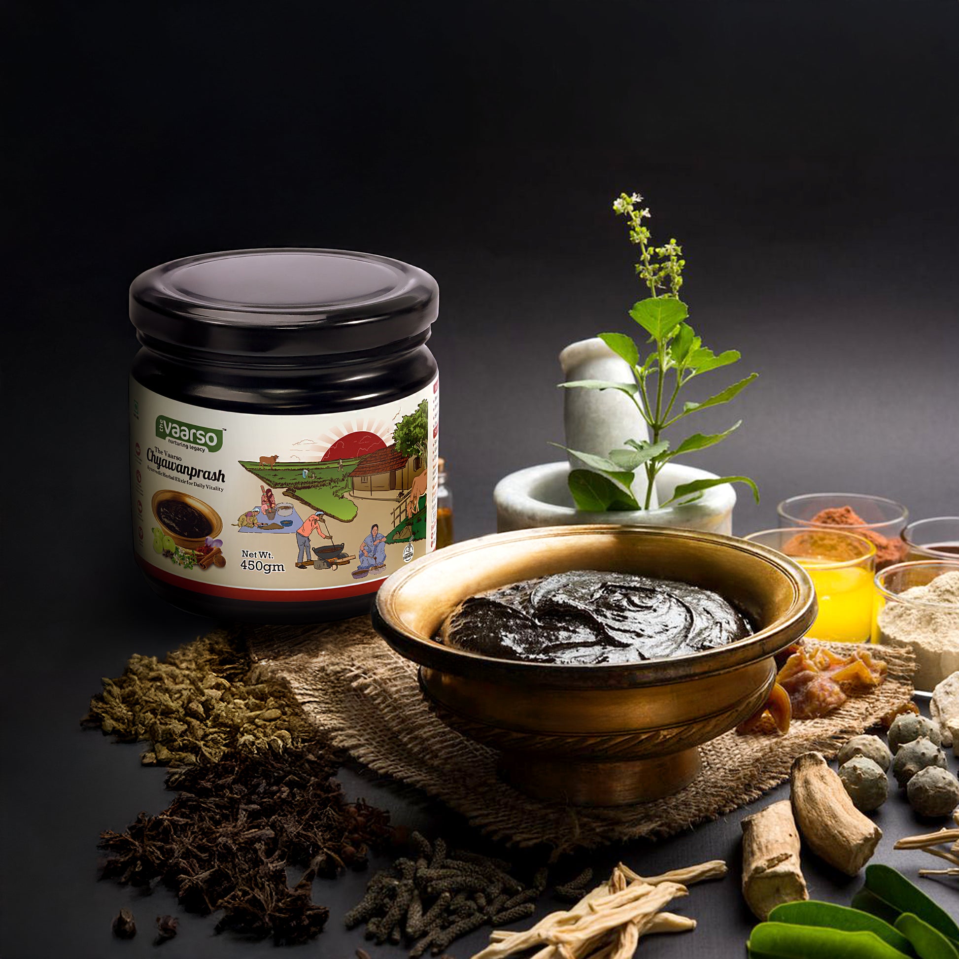 Vaarso Vedic Chyawanprash is made from organic herbs and fruits. It comprises of : Amla, Patala, Agnimantha, Gambhari, Bilva, Shyonaka, Gokshura, Shala parni, Brihat, Kanta kari, Pippali, Karkat shringi, Draksha, Guduchi, Haritaki, Bala, Tamalika, Vasa, Jiwanti, Shati Musta, Pushkara, Kakanasika, Mudgaparni, Mashaparni, Vidari, Bulbifera, Meda, Mahameda, Jivaka, Rishabhak, Kshir Kakoli, Ghrita, Vamsha, Tvak, Sukshamaila, Tvakpatra, Nagkesara, Bhrak Bhasma, Mukta Pishti, Akarkarabha, Lavanga, Kumkum, Sesame Oil and Honey. The Vaarso Vedic Chyawanprash is a combination of 49 herbs and 5 other ingredients. It is less sweet than other such products to increase its nutritional value and be less on calories. It is a 5000 year old Ayurvedic formula in the form of a multi-herbal jam. It is believed to be a “Rasayana” for all the tissues of the Human body. “Rasayana” promotes systemic rejuvenation of the mind and body. Antioxidant-rich spices, botanicals and herbs are combined in a specific amount with ghee, black sesame oil, jaggery and honey to make a delicious jam that can regularly be consumed to support overall health and vitality."